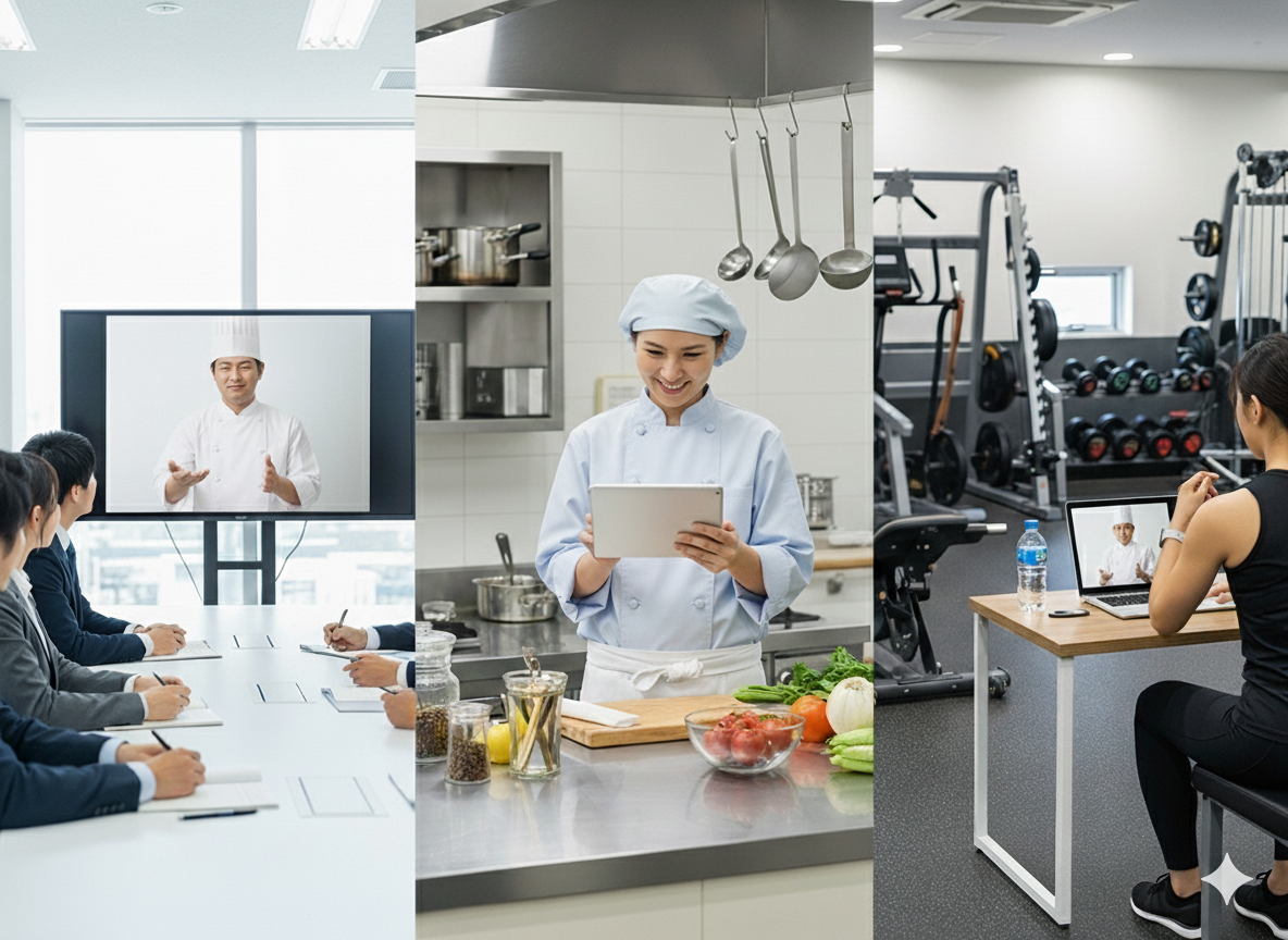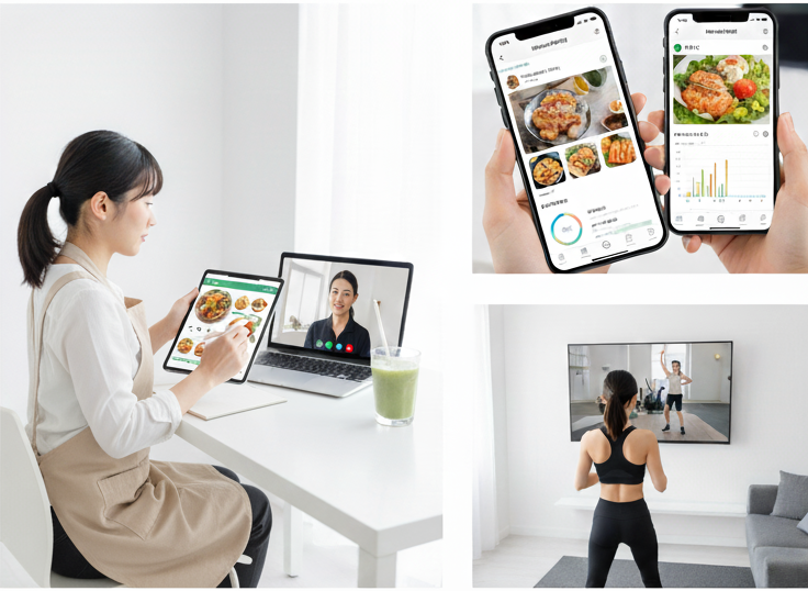 初心者からトレーニーまで対応。「高タンパク」「疲労回復」「低糖質」など目的別に学べるオンライン講座を、アプリ・SNS連携の継続サポート付きで開催します。